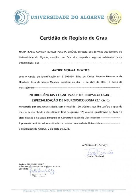 Sou Psicólogo Clínico e Neuropsicólogo, membro efetivo da Ordem dos Psicólogos Portugueses (Cédula Profissional n.º 31212), licenciado em Psicologia e com Mestrado em Neuropsicologia e Neurociências Cognitivas pela Universidade do Algarve. Possuo ainda pós-graduação em Psicologia Clínica e da Saúde, bem como em avaliação e intervenção neuropsicológica.
