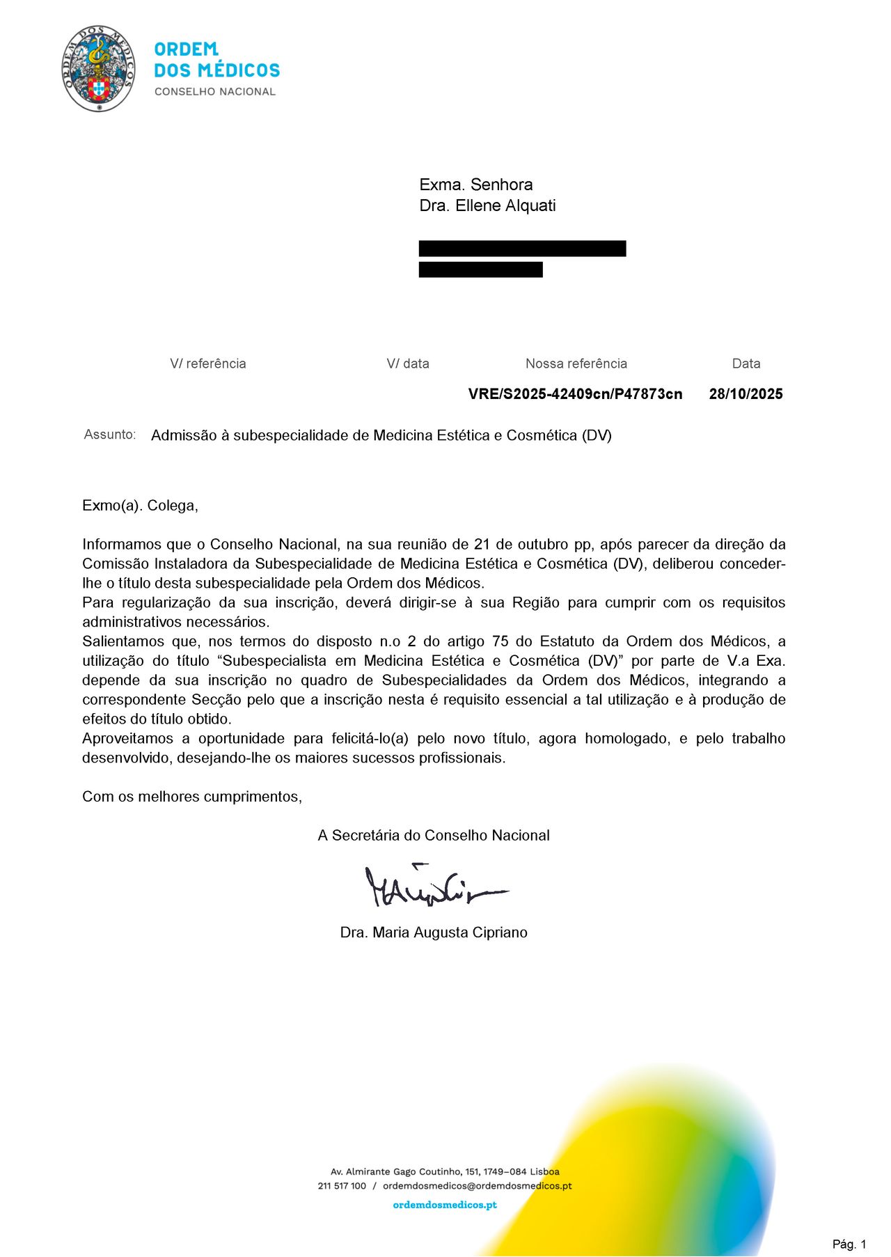Em 2020, concluiu o Mestrado em Ciências da Saúde pela Universidade de Lisboa, o que possibilitou a revalidação do diploma médico em Portugal e o registo ativo na Ordem dos Médicos (nº 73387). Estabeleceu-se oficialmente no país em 2022. Atualmente, além da atuação em consultório privado, integra a equipa do Instituto Português de Oncologia – IPO Porto, mantendo seu compromisso com o cuidado oncológico da pele.